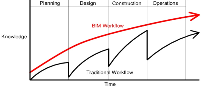 Royal Oracle adopts a Building Information Management (BIM) workflow which guarantees that knowledge is transferred better between successive implementation stages, unlike with the tradition workflow, as illustrated below.